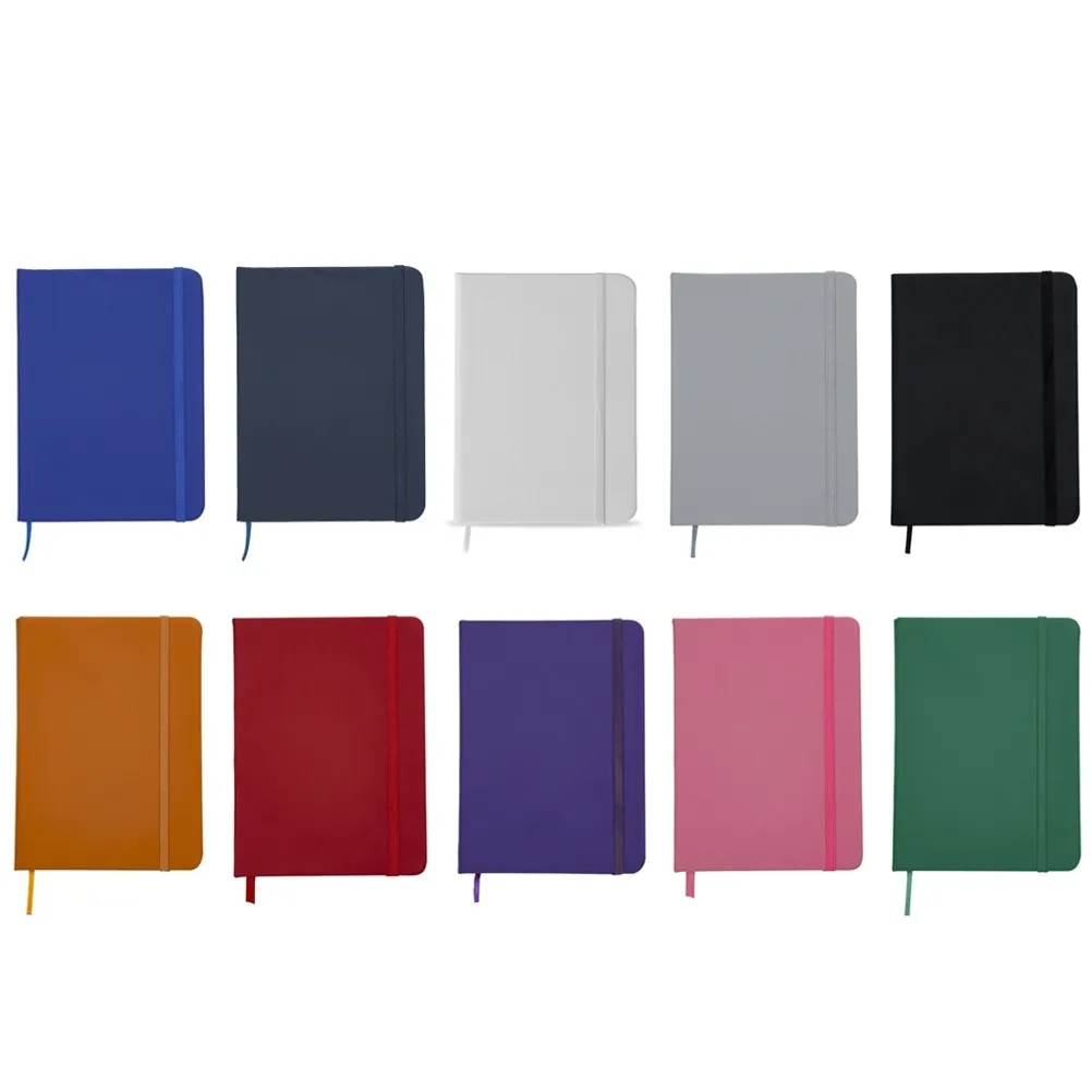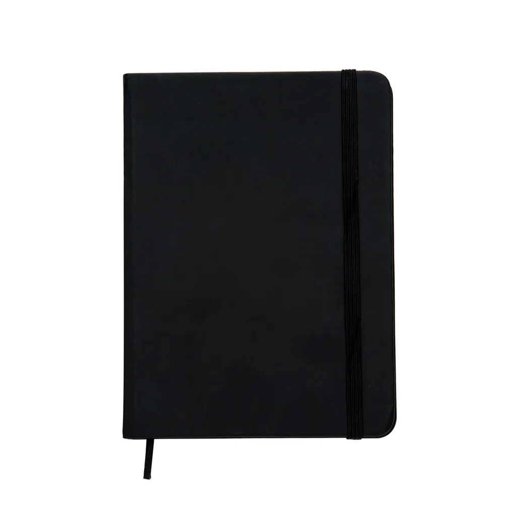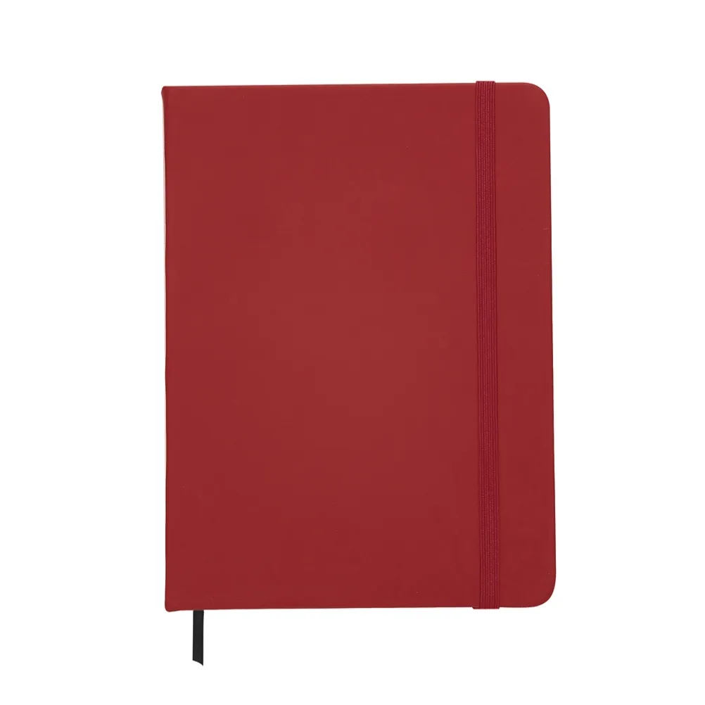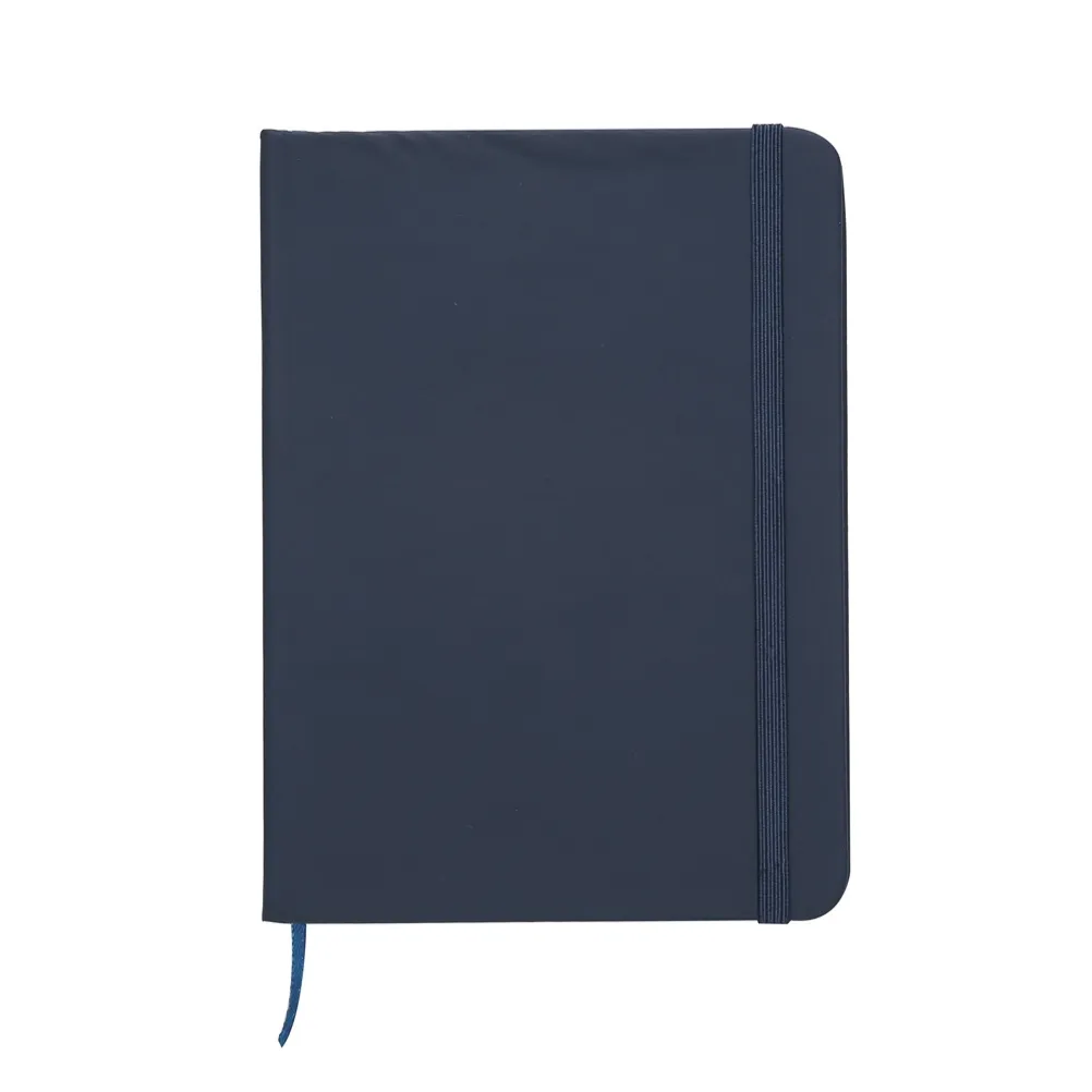 Caderneta emborrachada com pauta, elástico para lacre e marcador de página em cetim.