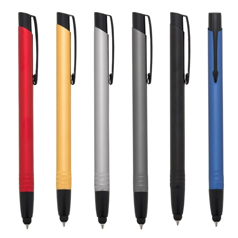 Caneta metálica com ponteira touch screen, carga esferográfica azul e acionamento por clique.
