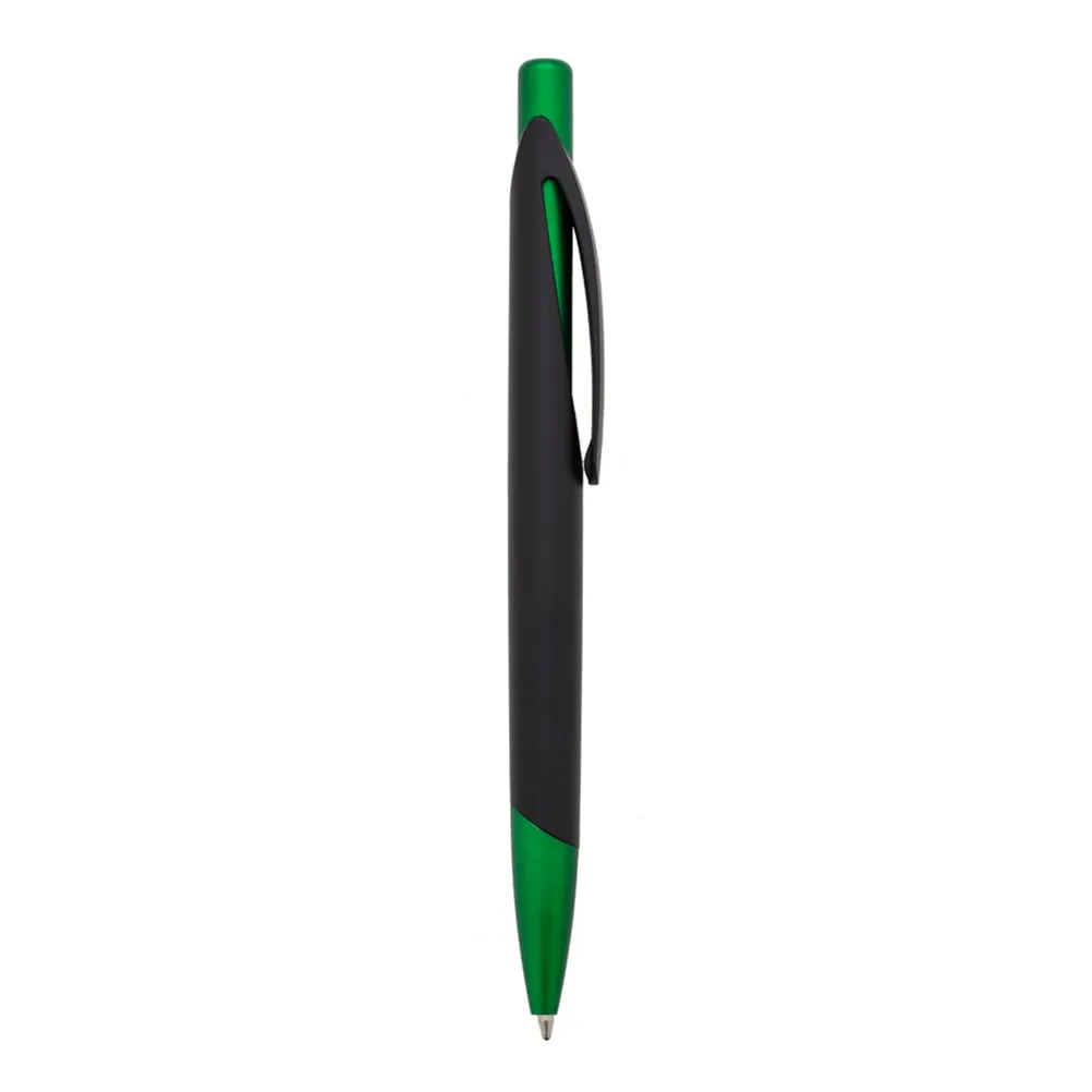 Caneta plástica com carga esferográfica azul e acionamento por clique.