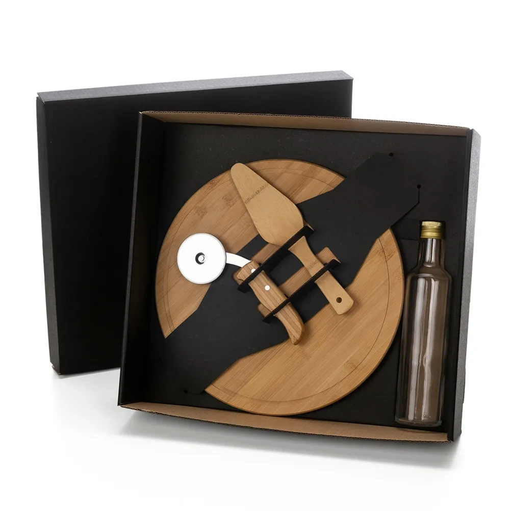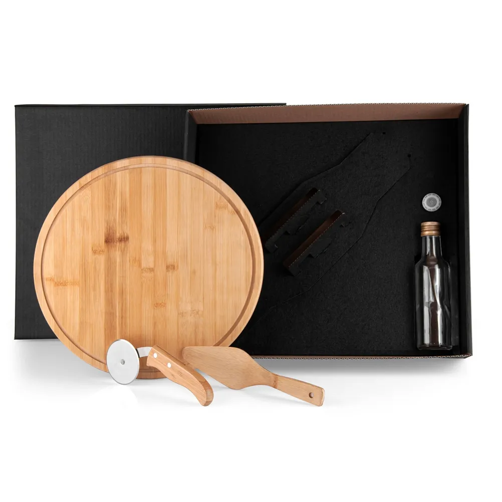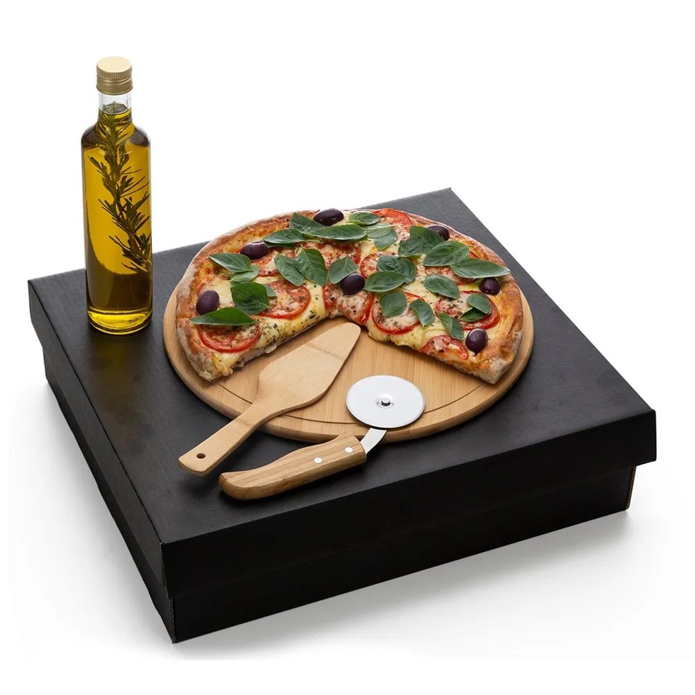 Conta com tábua redonda em tripla camada invertida e espátula em Bambu; cortador de pizza em Inox/Bambu; garrafa de vidro para azeite 250ml. Dimensões do produto: Tábua: 35x1,2cm Tipo de gravação: Uma gravação a Laser na tábua. Dimensões do produto: Tábua: 35x1,2cm Embalagem do produto: Caixa Preta Dimensões da embalagem: 460x410x130 mm (AxLxP) Peso da embalagem: 1.649 g