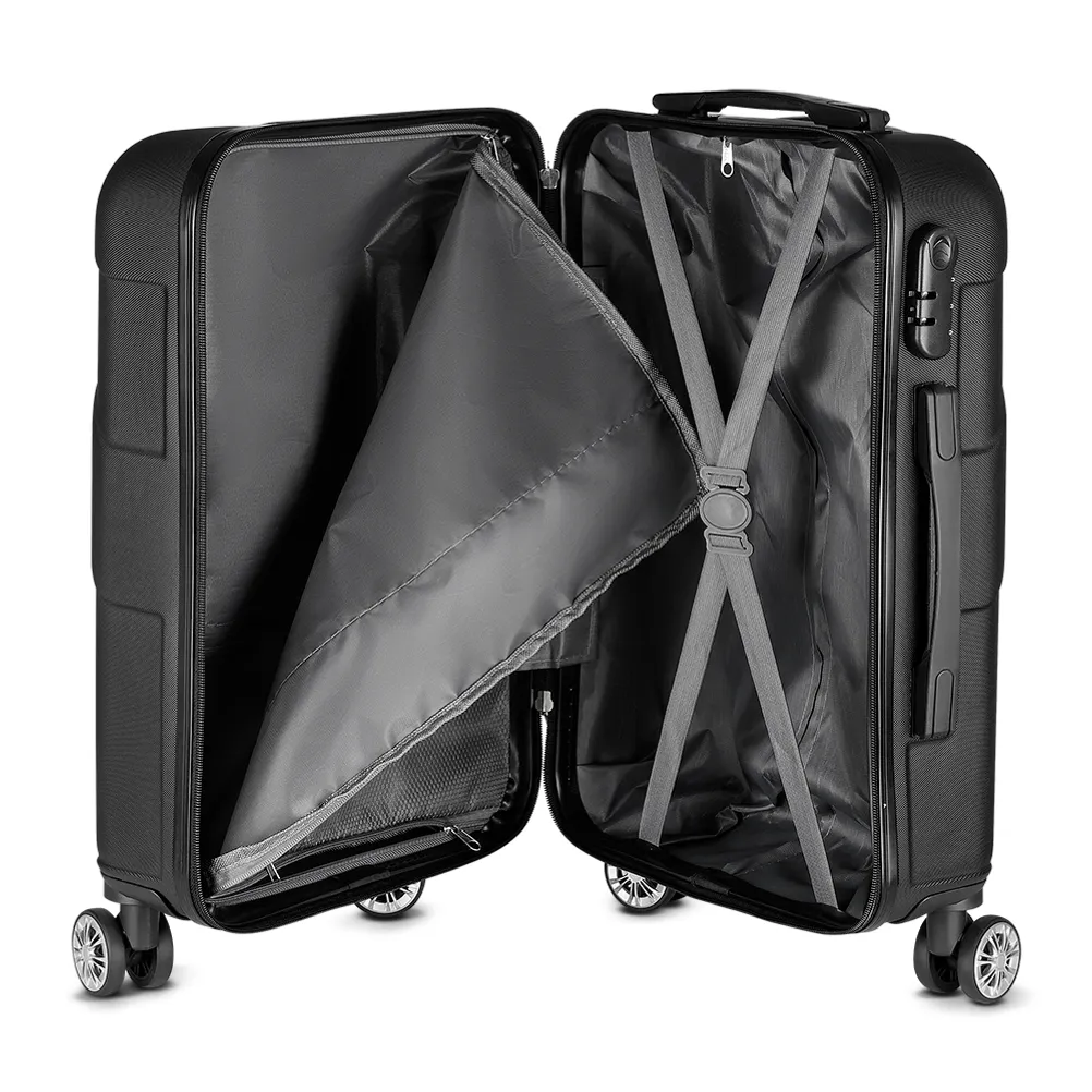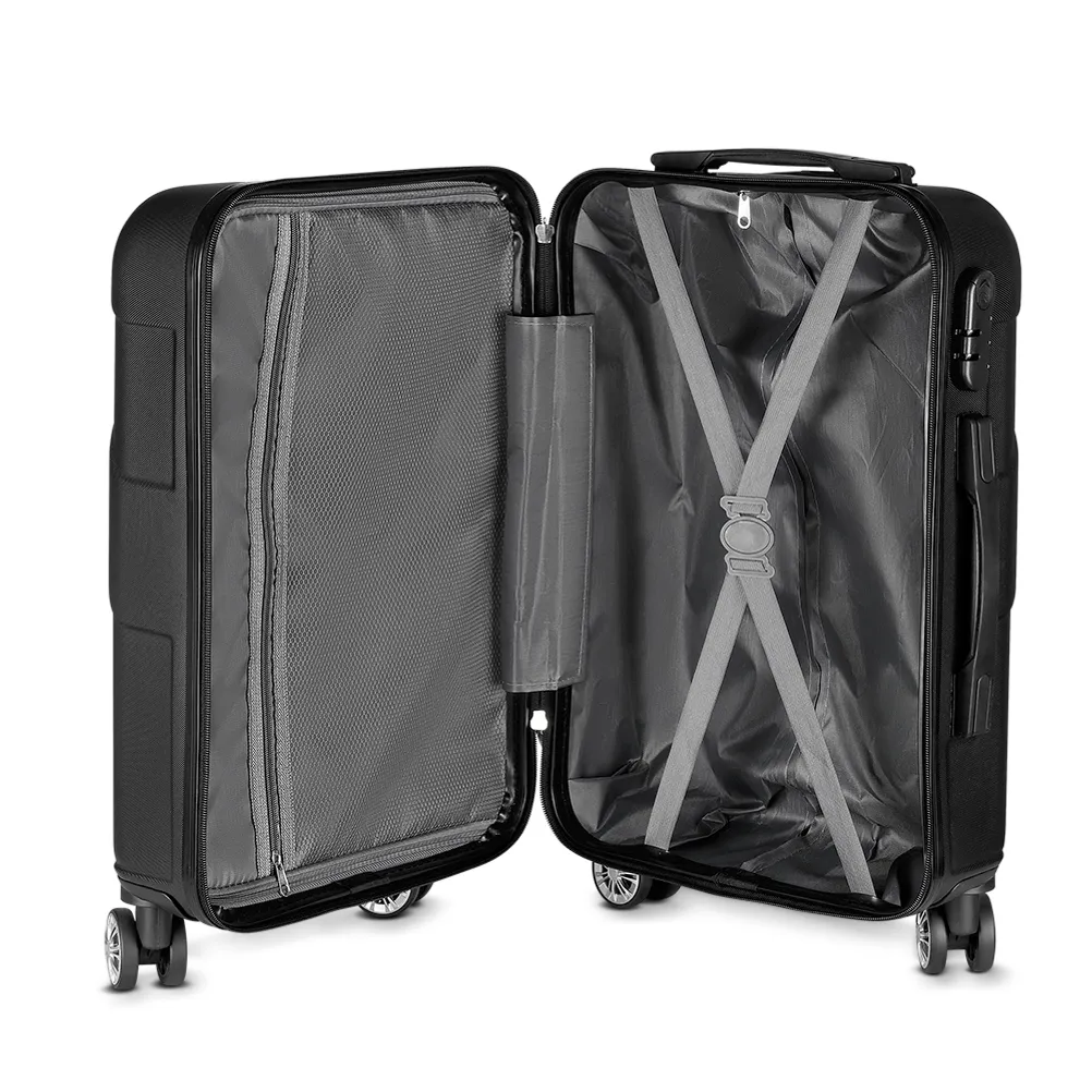 Mala de bordo em plástico ABS; Abertura frontal com ziper para acesso ao interior da mala; Forro poliéster; Sistema de carrinho de aço; Alça de mão na lateral e na parte superior; Quatro rodas de 360 graus; Acompanha Plaquinha de metal sem personalização. Mala perfurada para aplicação da plaquinha.