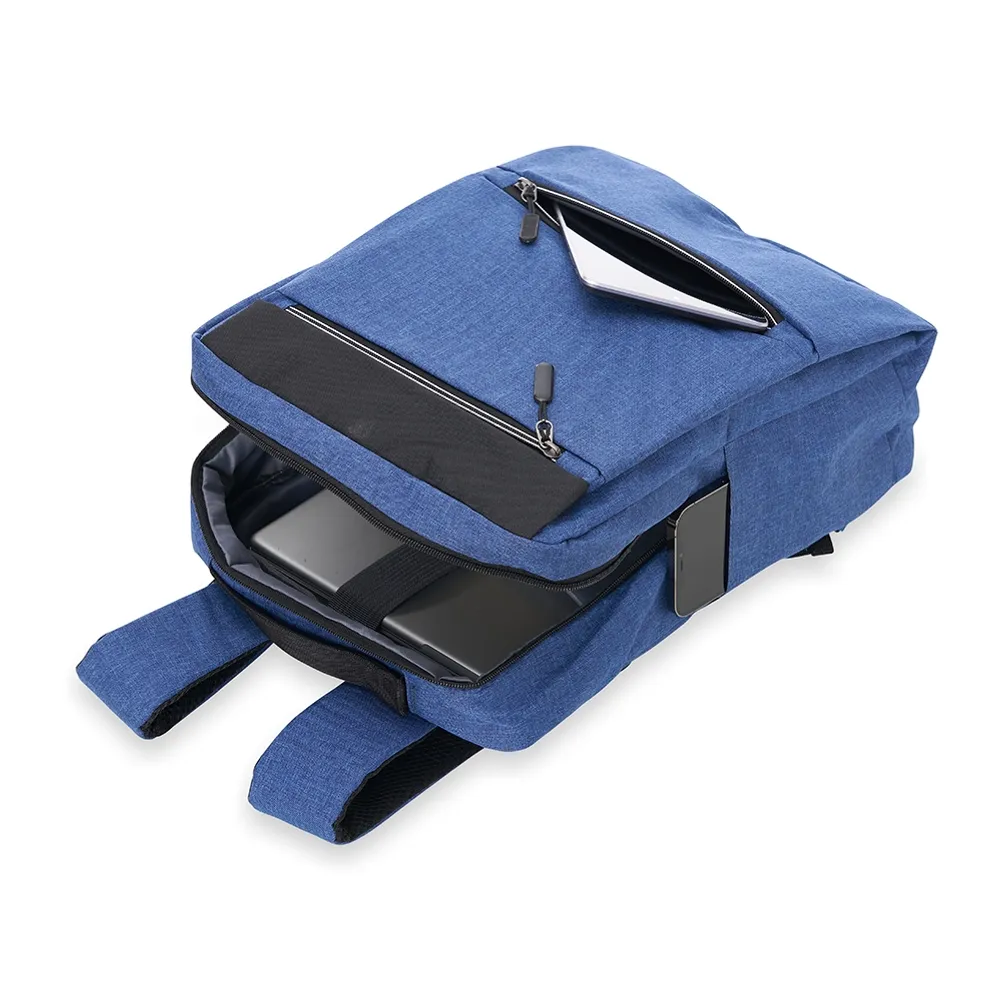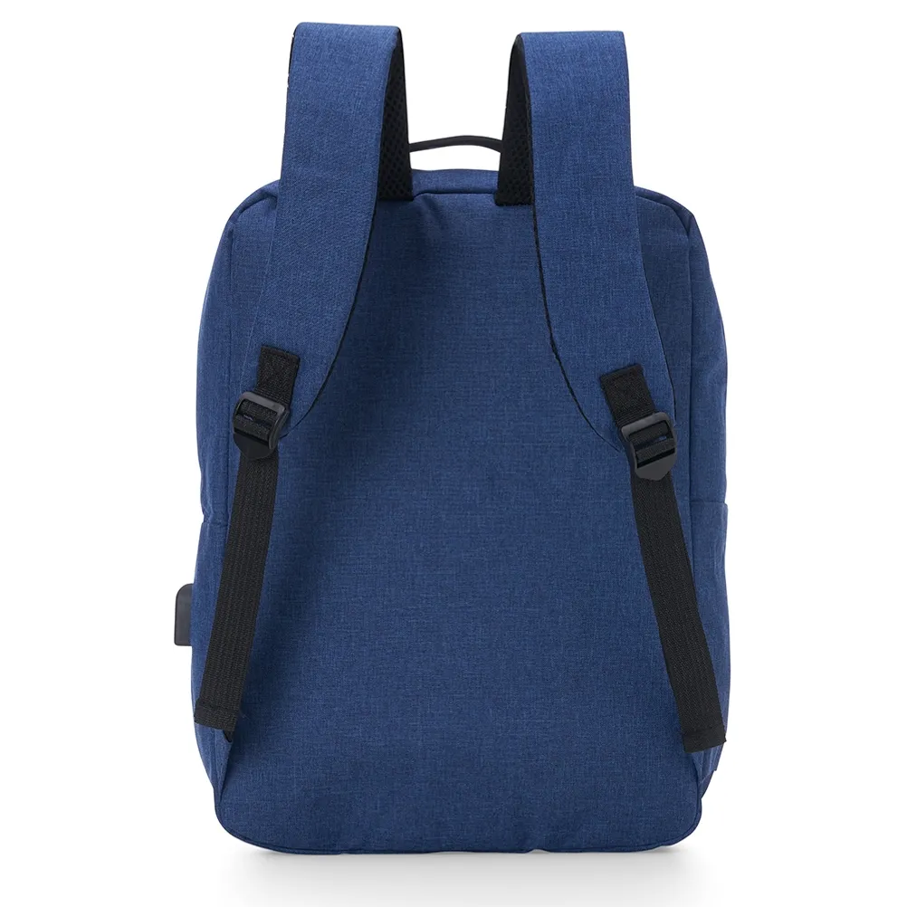 Mochila confeccionada em nylon com compartimento para notebook até 15,6 polegadas. Contém compartimento grande com divisórias para documentos, eletrônicos e caneta, dois compartimentos frontais com abertura horizontal, bolso lateral e adaptador USB externo com cabo acoplado, permitindo a conexão de um carregador portátil de dentro da mochila e transferência da carga para o lado externo, ocultando o carregador e viabilizando a utilização do celular durante o processo. Contém zíperes com pegadores plásticos, alça de mão em nylon e alças para as costas ajustáveis com revestimento espumado antitranspirante.