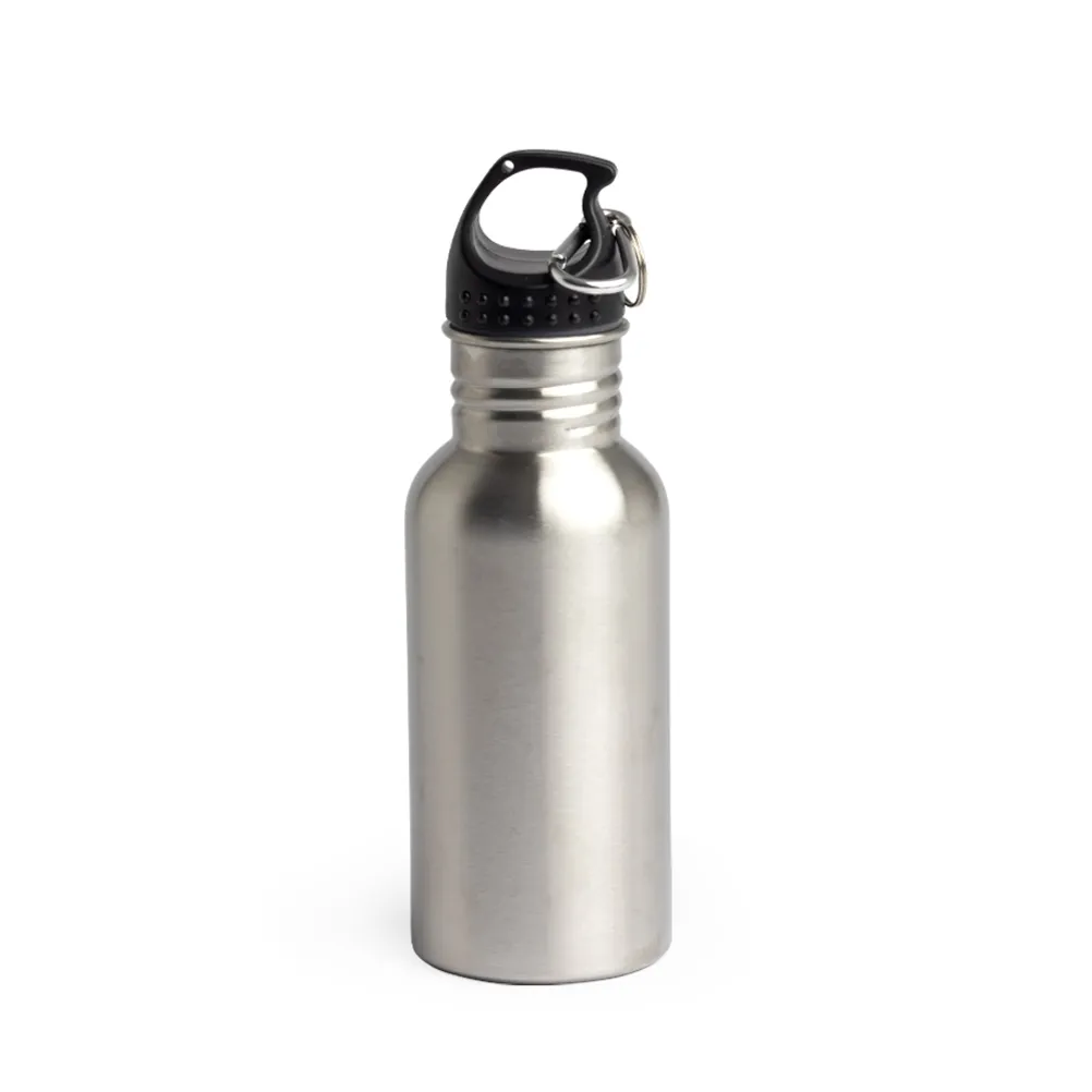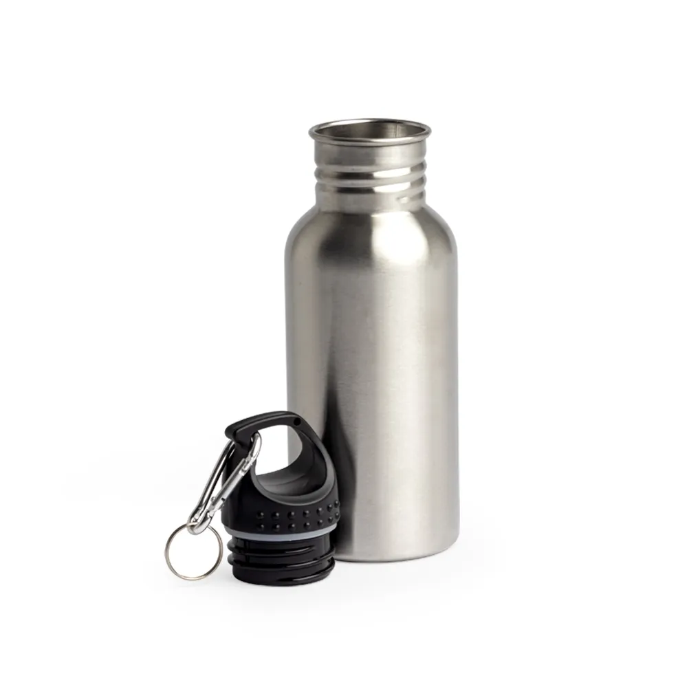 Squeeze inox com capacidade para 540ml. Possui tampa rosqueável com alça e acompanhada de um mosquetão.